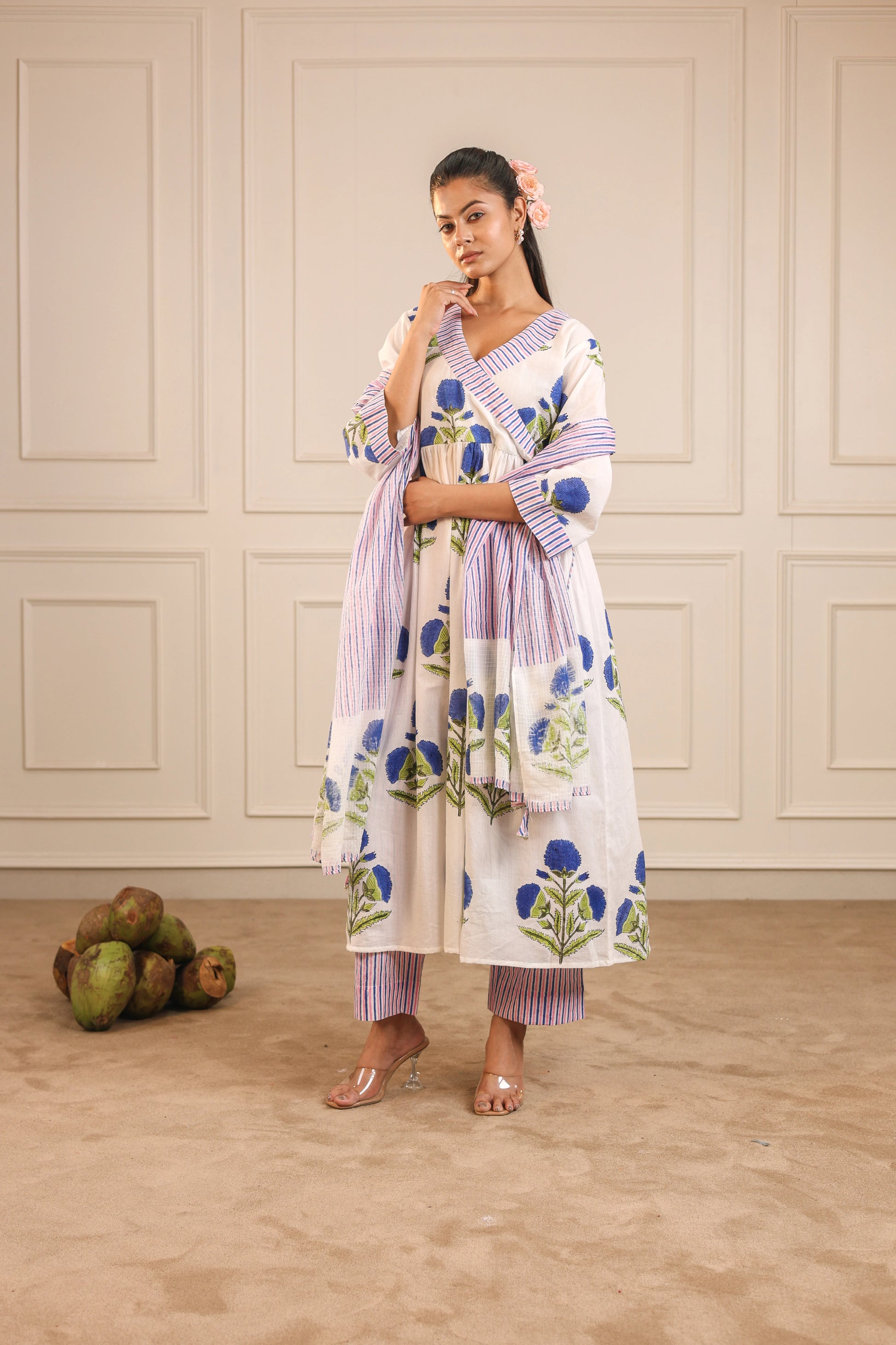 Make an everlasting impression at your next celebration with our elegant white Angrakha- style Anarkali set, handcrafted in soft, breathable cotton. Featuring intricate hand block prints paired with striped cotton pants and a breezy Kota Doriya dupatta, this ensemble blends traditional grace with everyday comfort. The flattering Angrakha neckline and flowy silhouette make it ideal for festive brunches, summer weddings, or intimate gatherings.