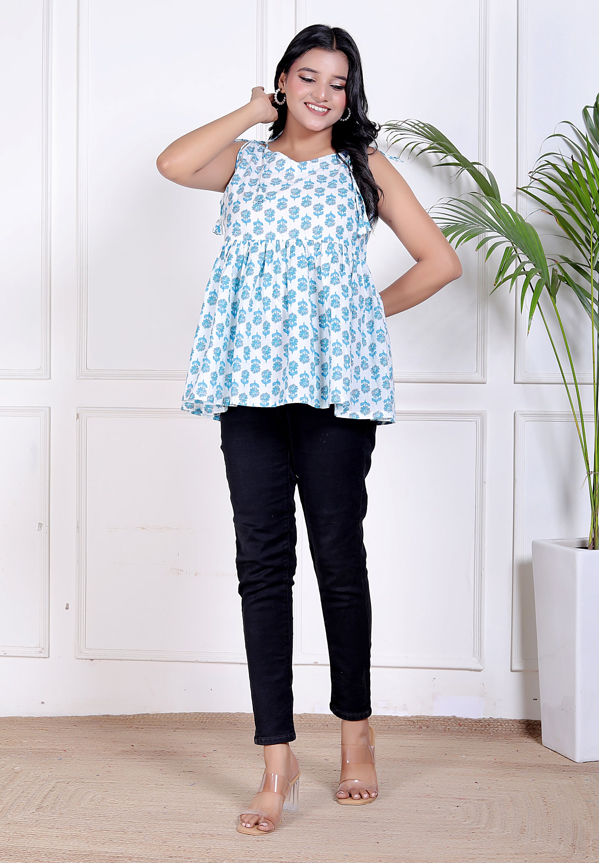 Light, playful, and effortlessly charming — this sleeveless cotton top is made for sunny days and easy moods. The delicate blue floral print on a crisp white base gives it a fresh, breezy feel, while the flared hem adds just the right amount of twirl and movement. Designed in soft, breathable cotton, it keeps you cool and comfortable all day long.
