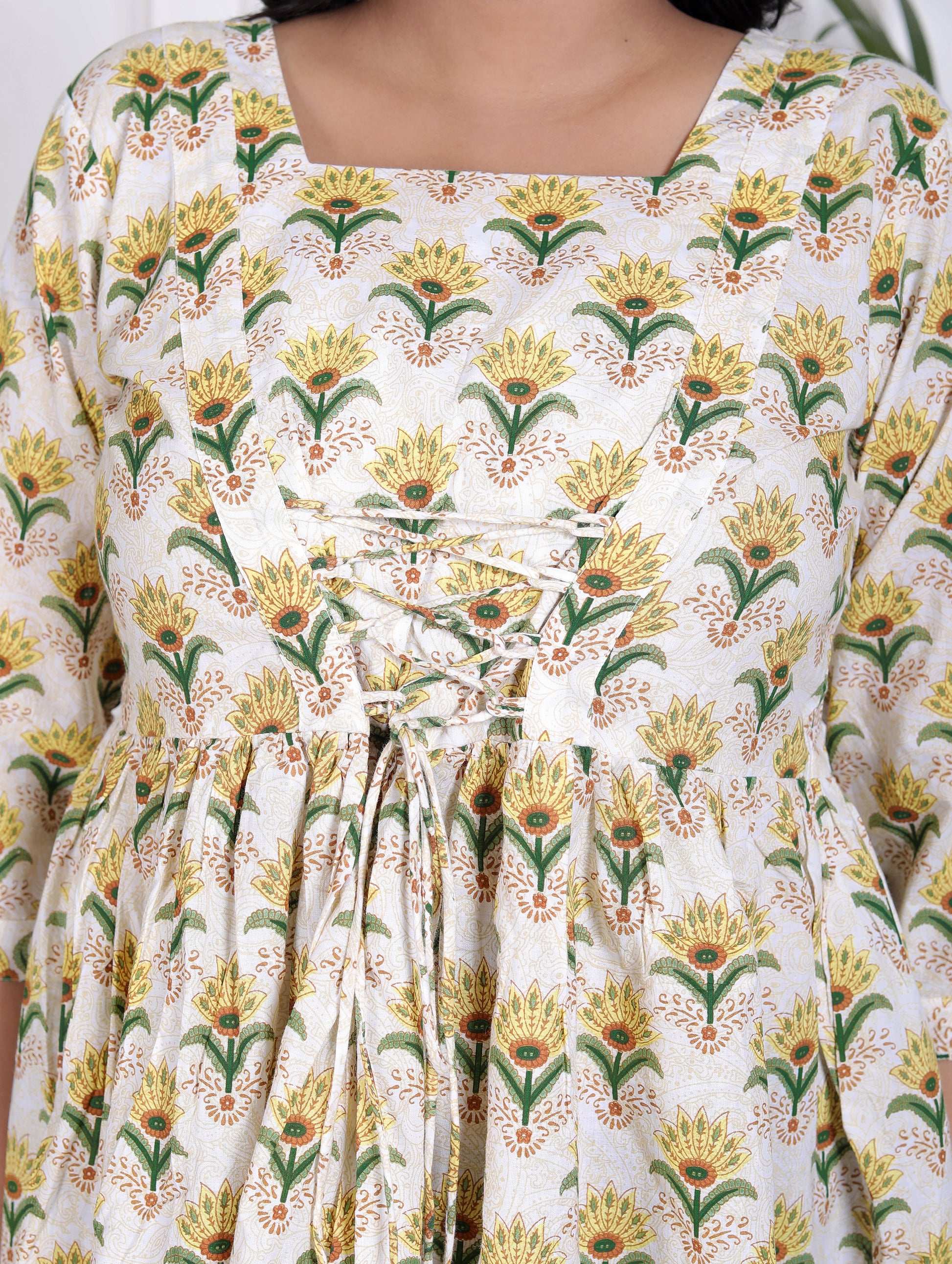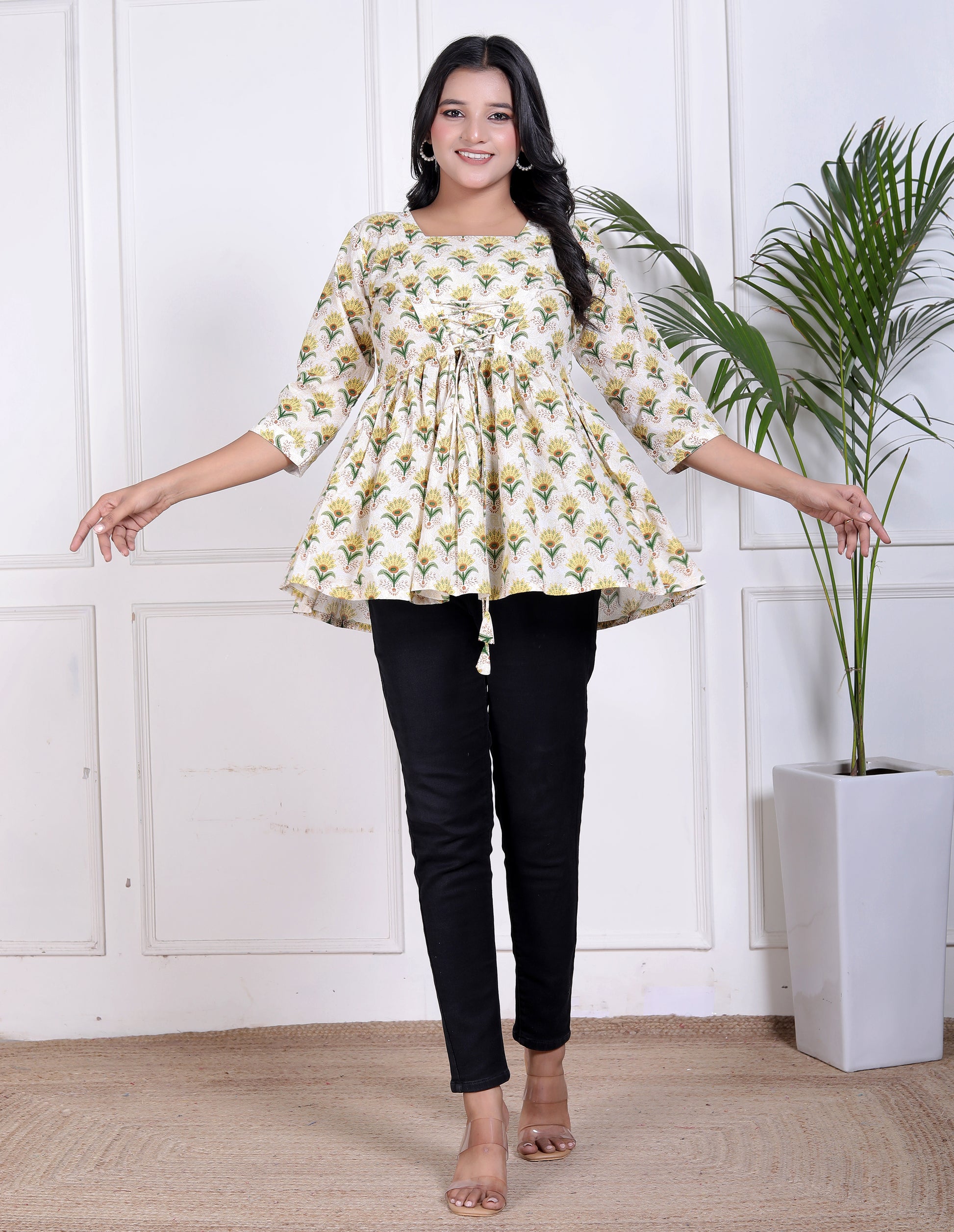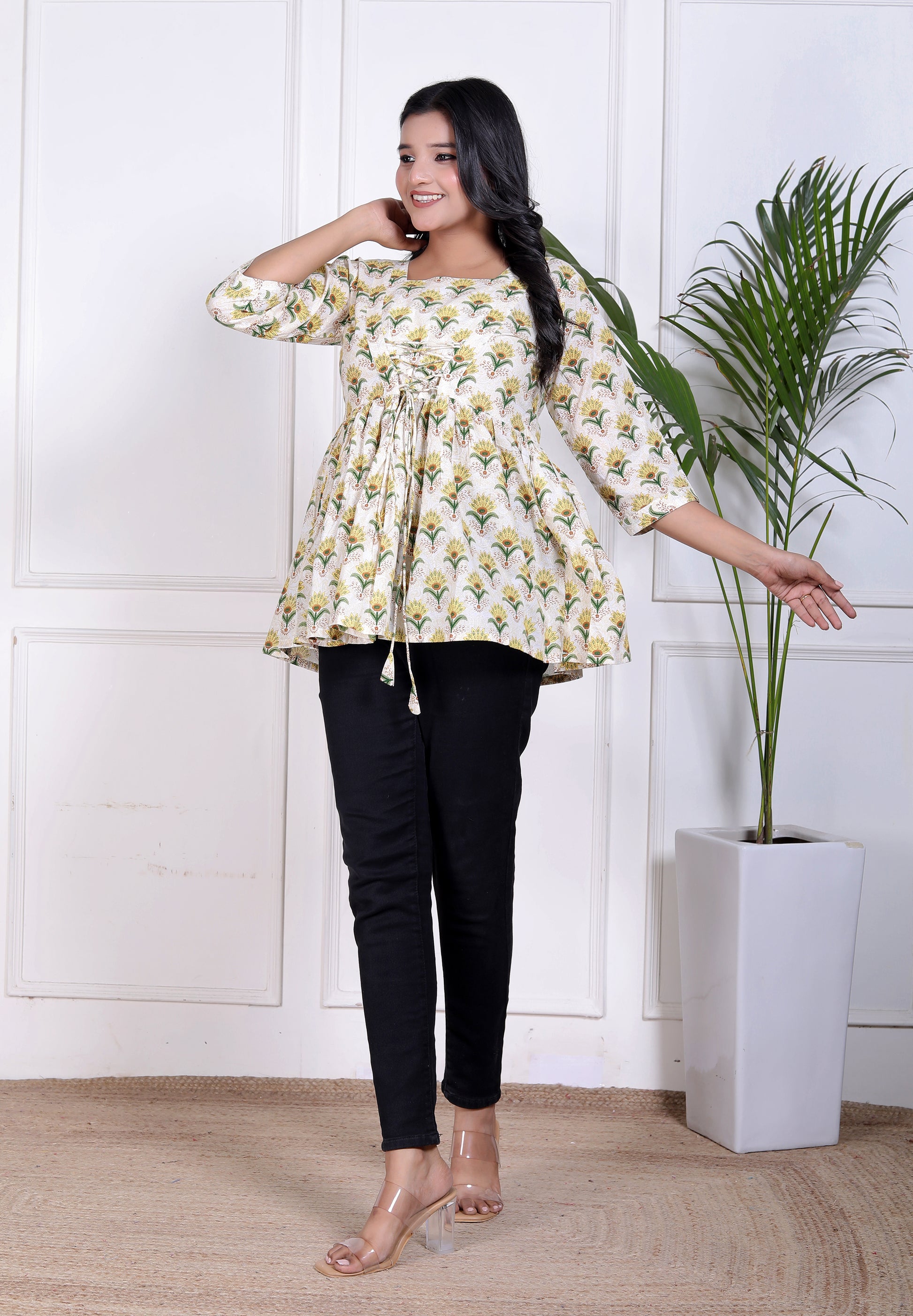 Brighten up your wardrobe with this cheerful mustard floral cotton peplum top — a perfect mix of comfort and casual charm. Made with breathable cotton fabric and featuring a flattering empire waist with a drawstring tie, this piece is ideal for everyday wear or weekend outings.