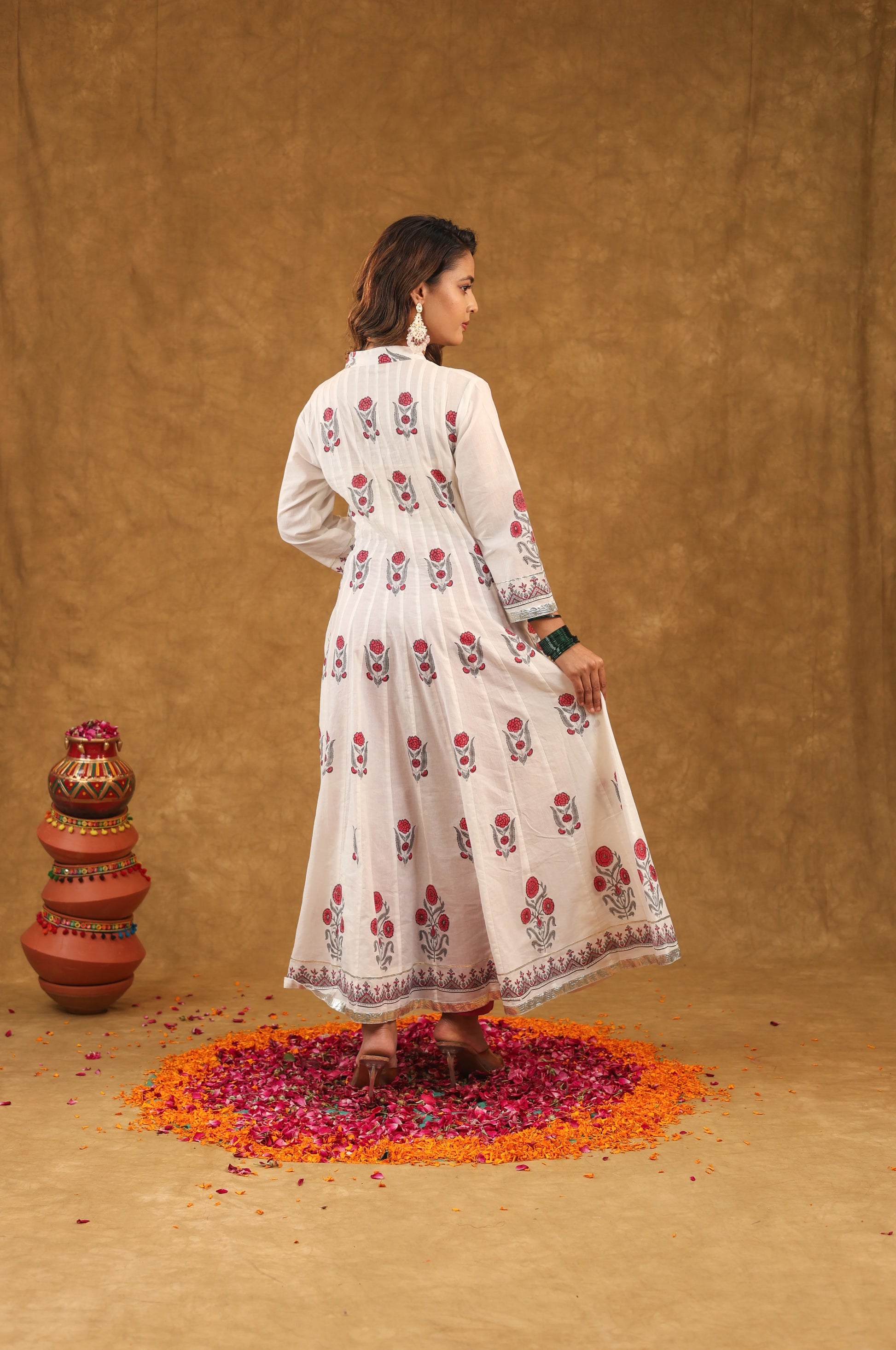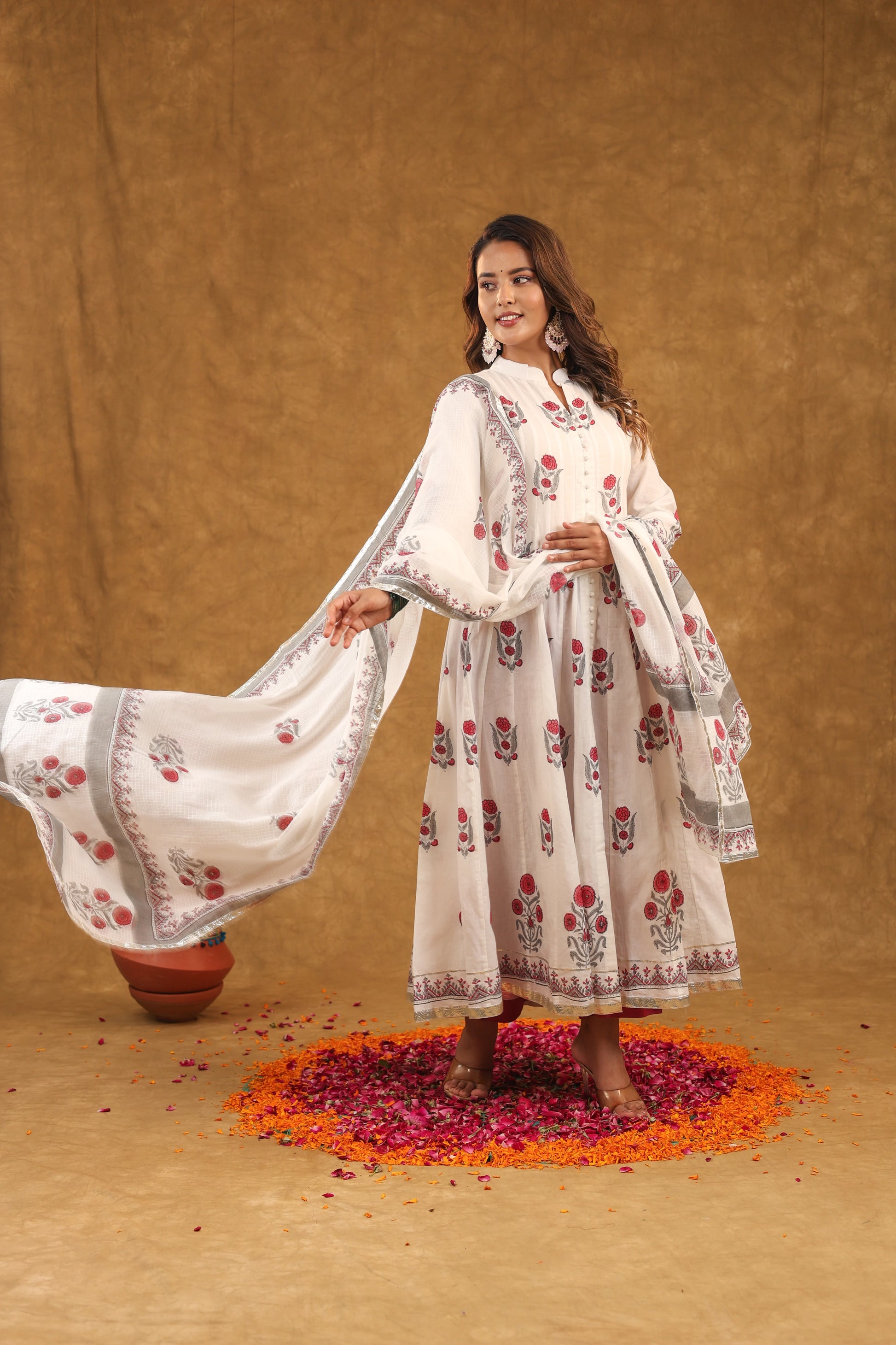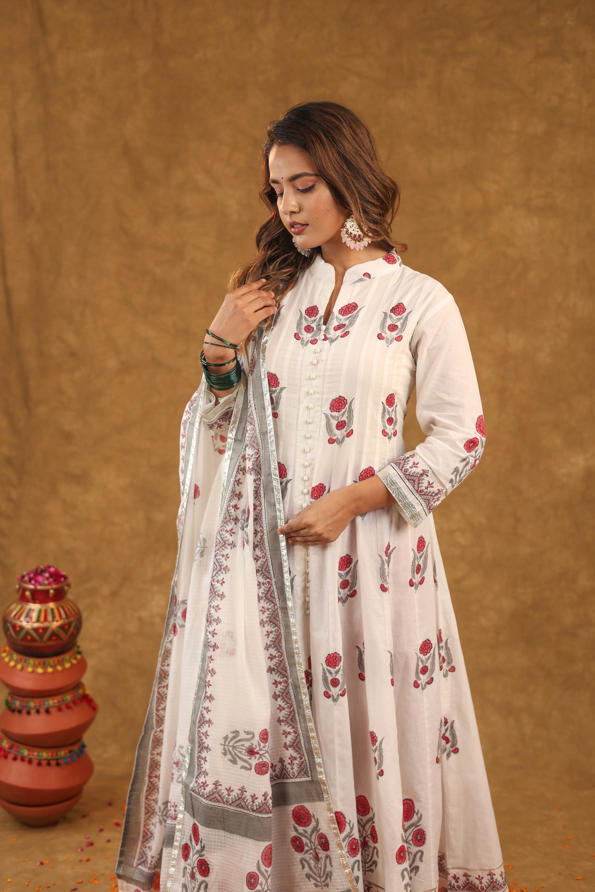 Ever-so-soft. Crafted in breathable cotton, Chand is a white kalidar suit that radiates effortless grace. Adorned with subtle block prints and delicate gotta detailing, it pairs beautifully with a feather-light Kota Doriya dupatta. A timeless piece perfect for poojas, summer festivities, or serene daywear.