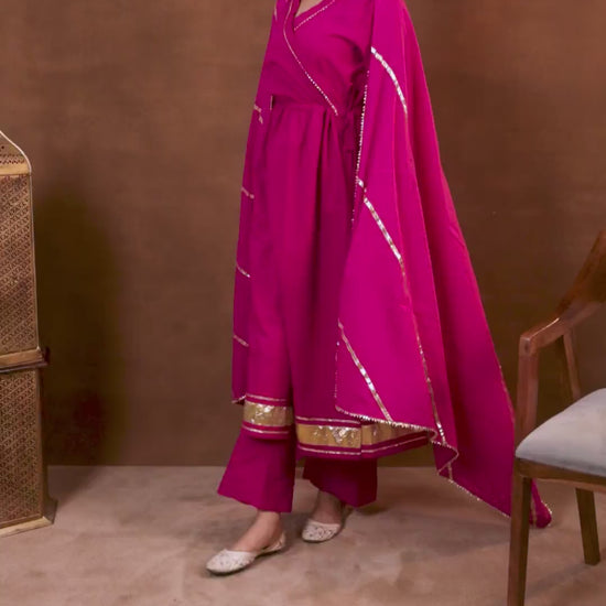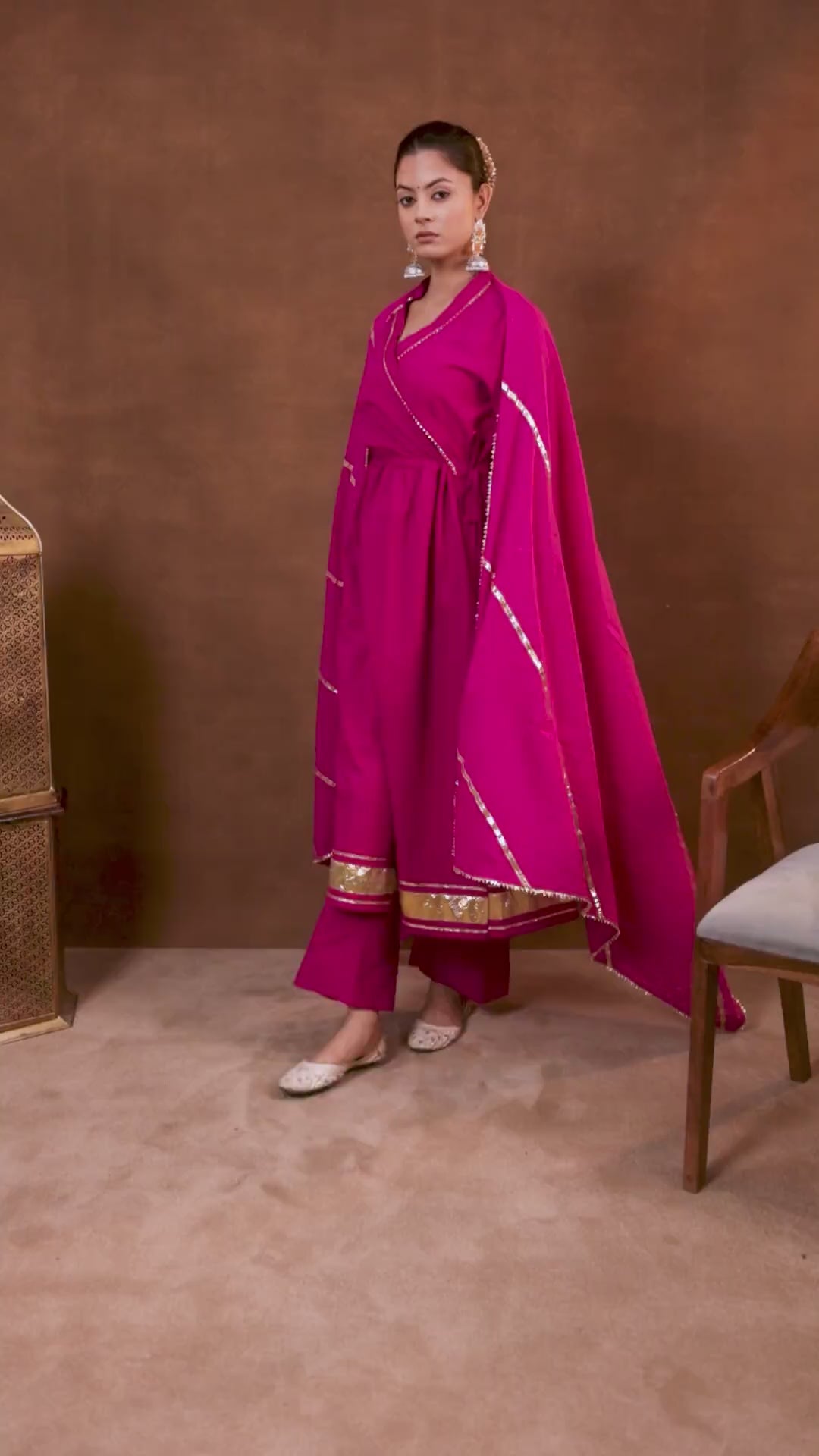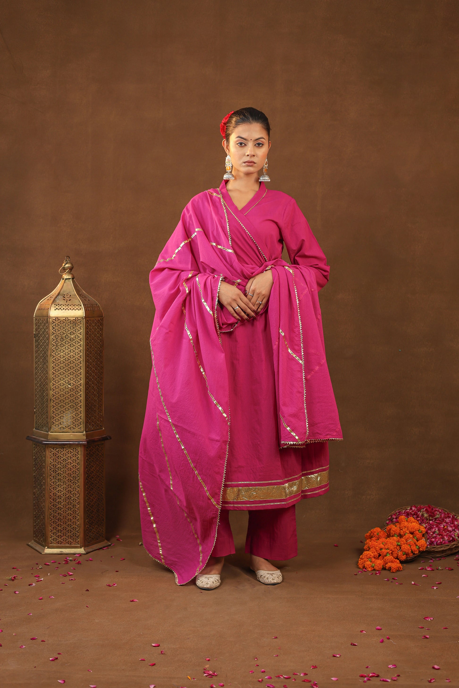 Channel bold festive energy in our vibrant Rani Pink Angrakha-style Anarkali set, crafted in soft cotton and highlighted with delicate laffa gota embroidery. The elegant angrakha silhouette features a flattering wrap-tie design, paired with matching cotton pants and a