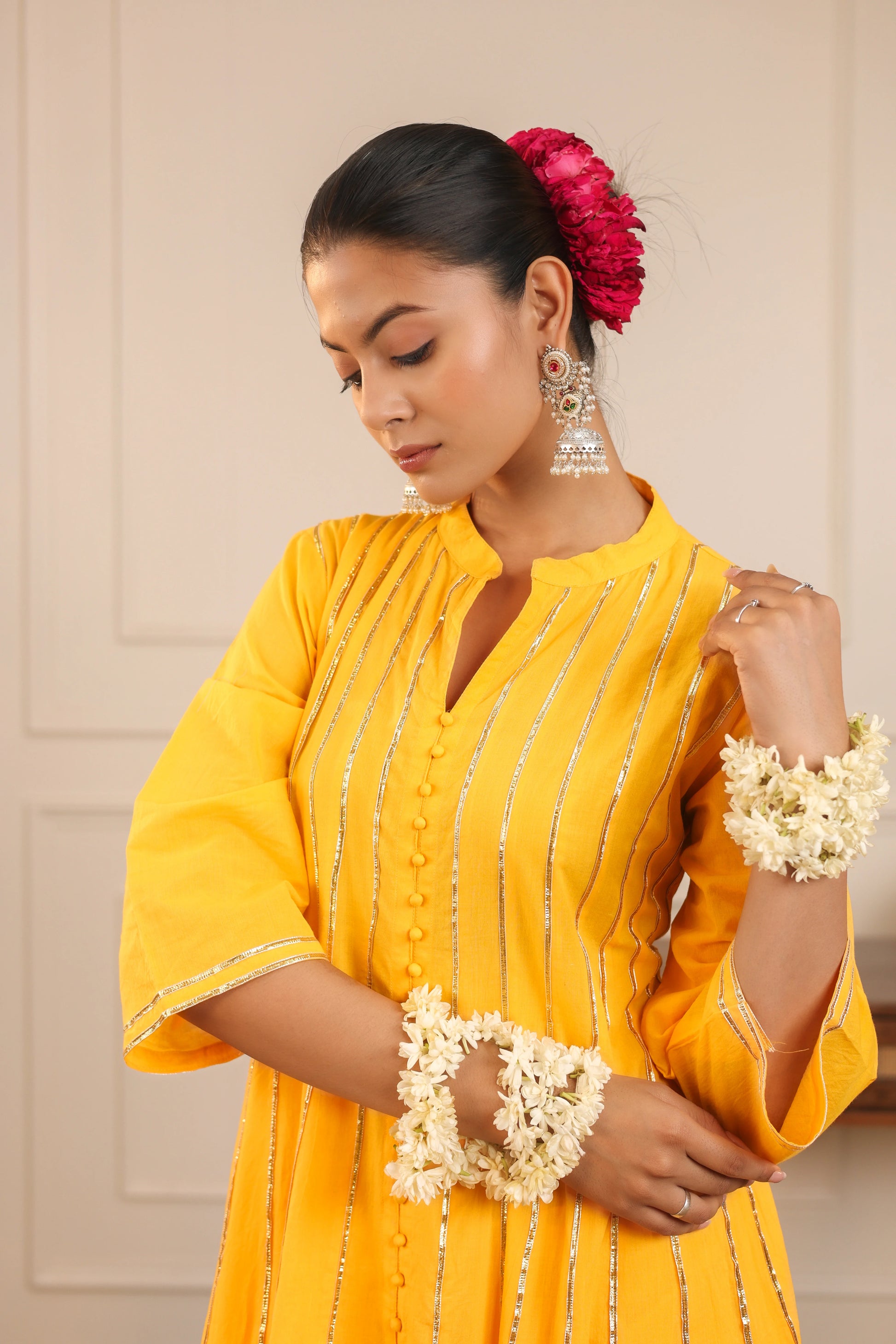 Bring sunshine to your celebrations with our radiant yellow kalidar Anarkali suit set. Crafted in soft, breathable cotton and paired with a breezy Kota Doriya dupatta, this ensemble is highlighted with delicate gotta embroidery that adds just the right touch of shimmer. Lightweight, festive, and full of flair — it’s perfect for daytime festivities, haldi functions, or joyful family gatherings.