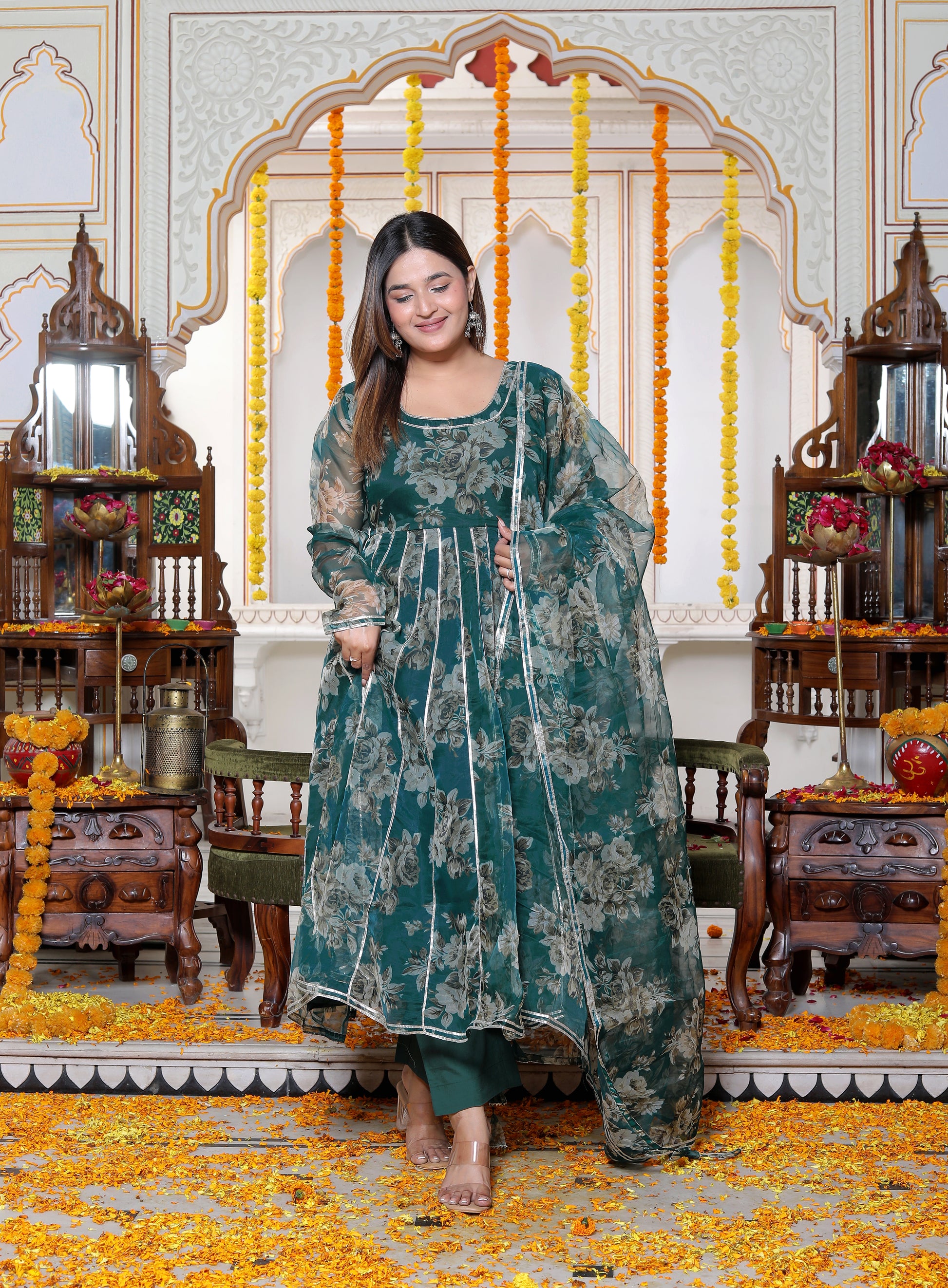 Slay in style all day long with our manjari organza phool jaal anarkali set. The classic phool jaal print makes it an absolute stunner. Featuring a Round-neck with round back with beautiful tassels and a beautiful floral dupatta, it’s a wardrobe essential.