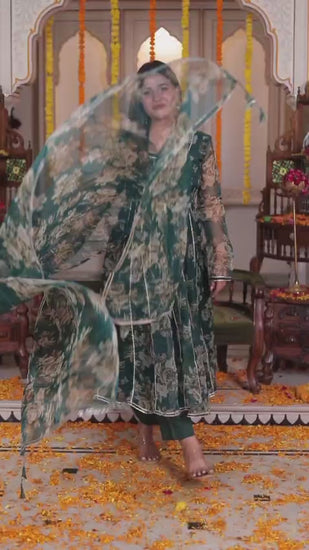 MINAKARI GREEN ORGANZA ANARKALI SUIT SET