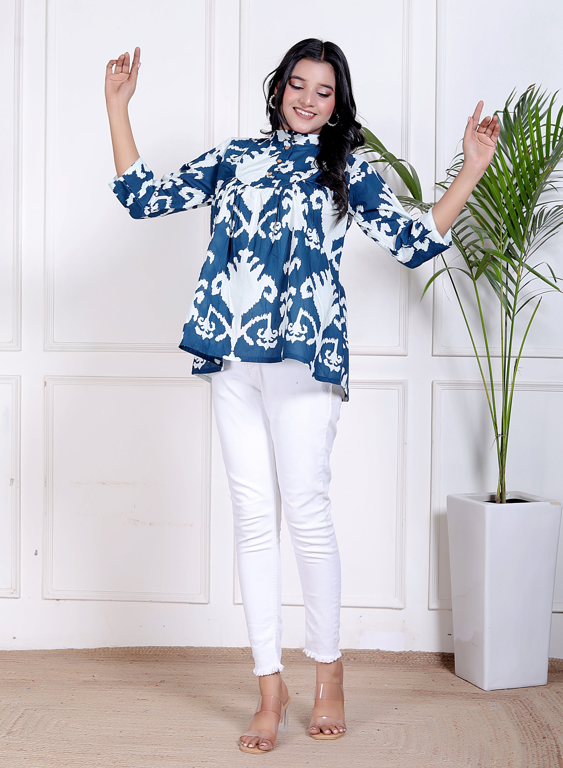 Elevate your everyday wardrobe with this indigo blue cotton top featuring bold white floral prints. Designed for both comfort and versatility, this piece is tailored in breathable cotton with soft gathers below a flap-style front panel, creating a relaxed and flattering silhouette. The mandarin collar and 3/4th sleeves add a refined touch, making it suitable for casual outings, work-from-home wear, or day-to-day errands.