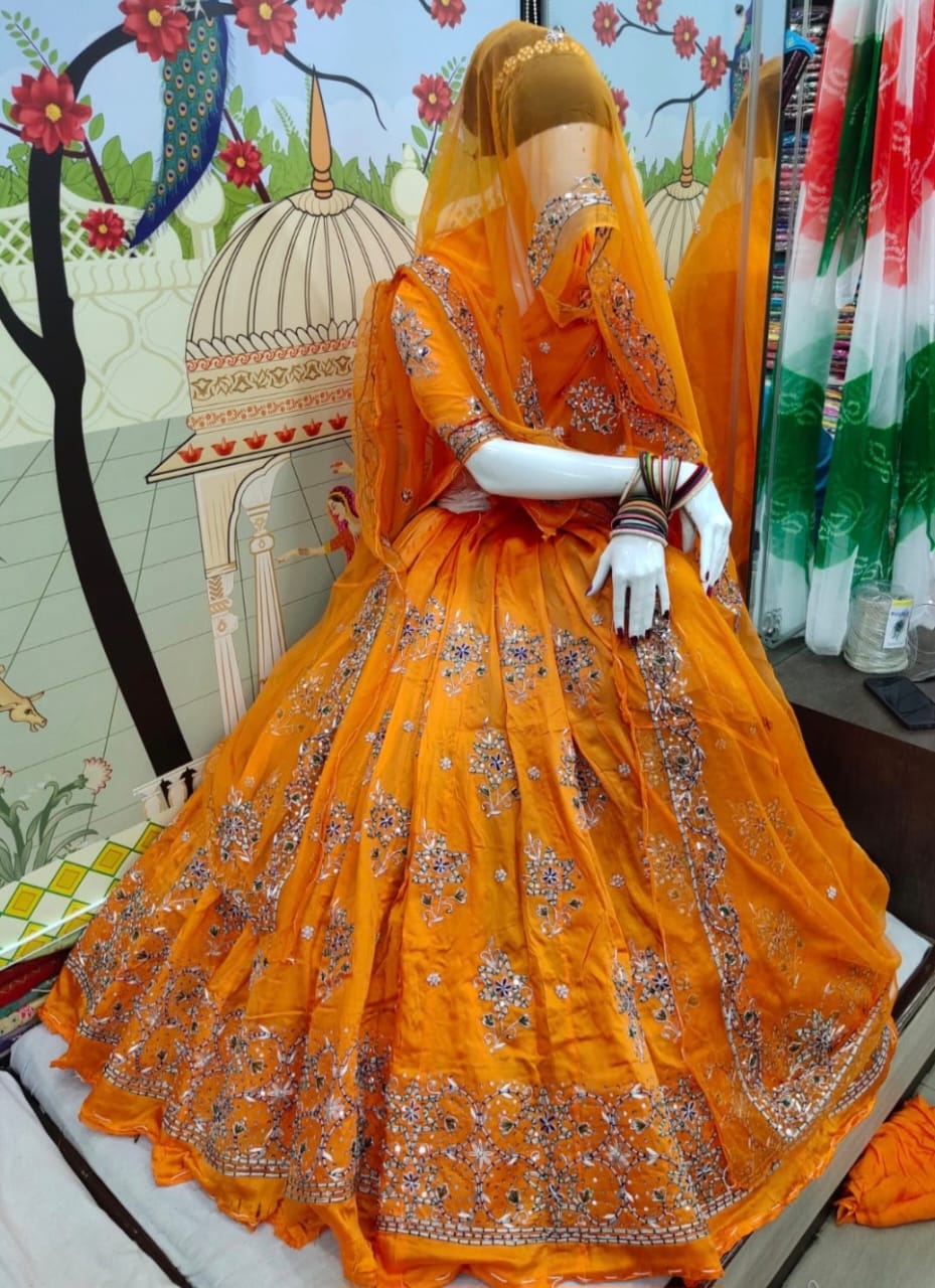 The symbol of royalty and traditional culture, this poshak is certainly a stunner. The poshak comes in 4 pieces- Lehenga/ Ghaghara( long skirt), Kurti( top), Kanchali( choli) and an odhna( dupatta) . The poshak is mustard shaded and the odhna is made of pure georgette. It has intricate patterns and depicts big eagles on the ghagra ( long skirt) and the odhna( dupatta). It’s embellished with heavy zardosi dori work . It’s a very graceful and an elegant costume. Team it up with heavy jewellery and you are sure to stand out.