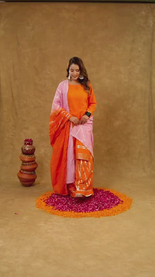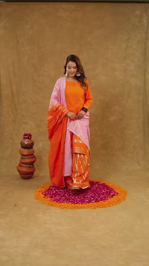 Soft, elegant, and thoughtfully detailed – the Kesar Phool Sharara Set is crafted in breathable cotton, perfect for long festive days or intimate celebrations. Adorned with subtle gota highlights and paired with a lightweight mulmul dupatta, this outfit is designed to bring ease and elegance together. The flared sharara adds a graceful flow, making it ideal for day functions or light festive wear.