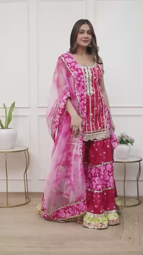 This cotton sharara set in a dreamy blend of pink is adorned with delicate gota work that adds just the right festive sparkle. Lightweight, breezy, and full of charm — it’s your perfect pick for intimate gatherings, poojas, and day events.