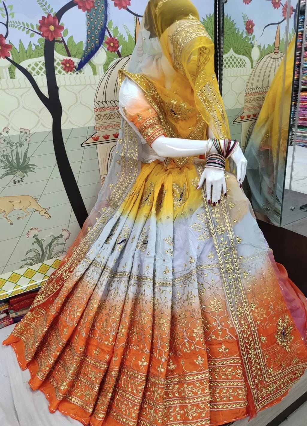 The symbol of royalty and traditional culture, this poshak is certainly a stunner. The poshak comes in 4 pieces- Lehenga/ Ghaghara( long skirt), Kurti( top), Kanchali( choli) and an odhna( dupatta) . The poshak is mustard shaded and the odhna is made of pure georgette. It has intricate patterns and depicts big eagles on the ghagra ( long skirt) and the odhna( dupatta). It’s embellished with heavy zardoszi danka work . It’s a very graceful and an elegant costume. Team it up with heavy jewellery and you are sure to stand out.