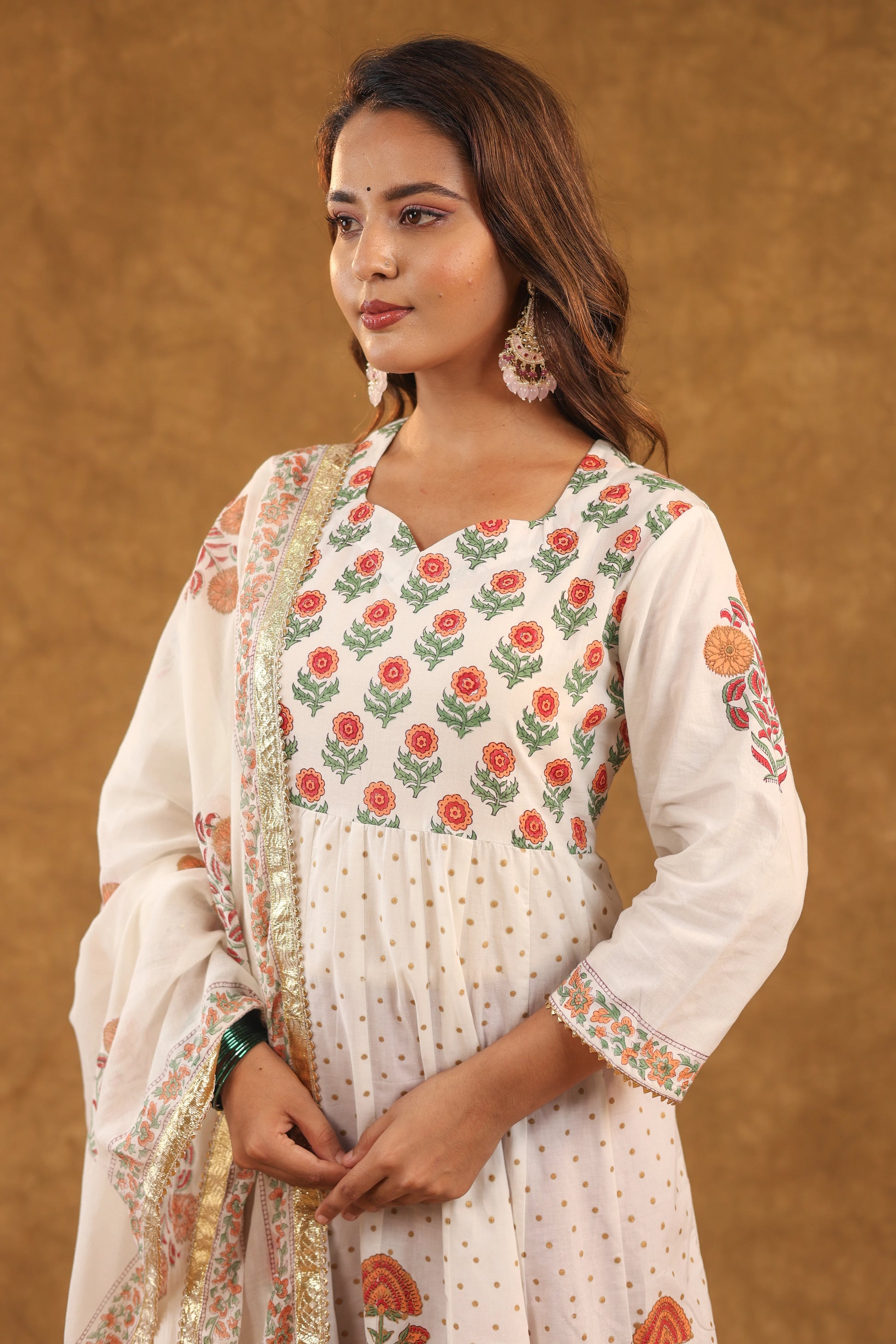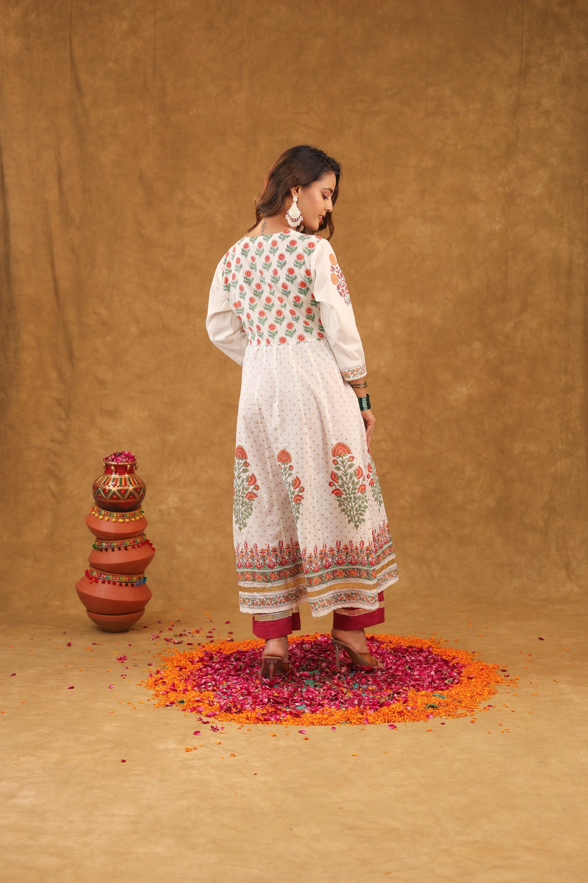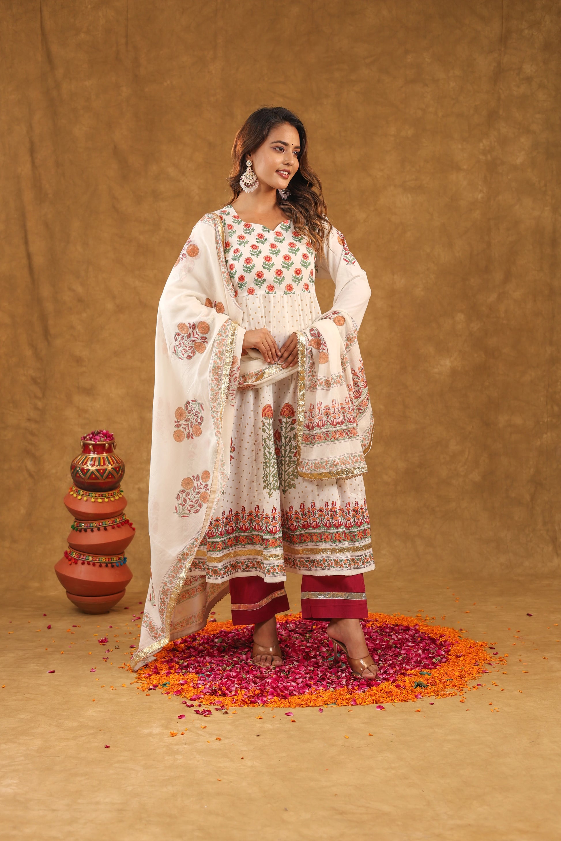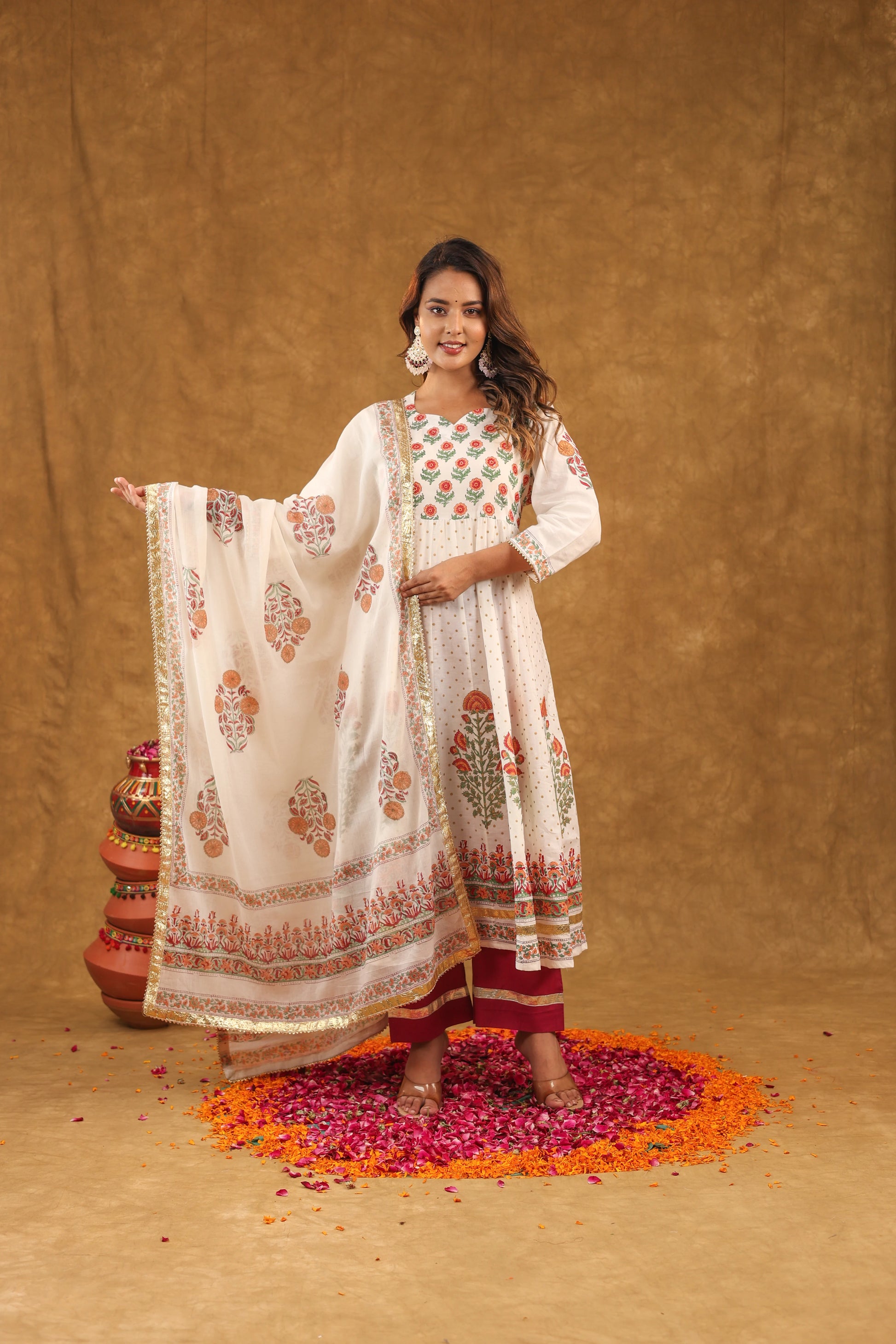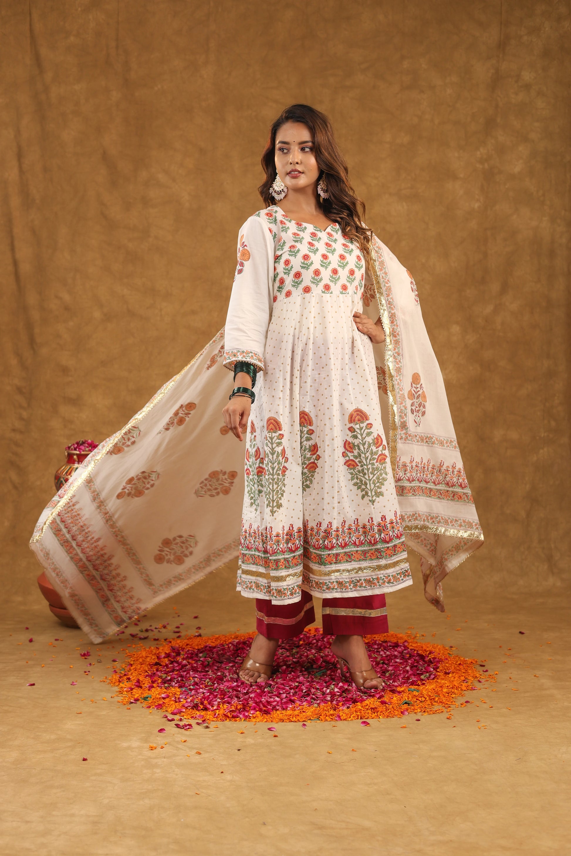 Fresh like a garden breeze — Rosy Daydream is a soft white cotton suit adorned with beautiful hand block-printed floral motifs. The intricate gotta lace work adds a delicate festive charm, while the malmal dupatta brings lightness and flow. A perfect pick for day functions, poojas, or a casual festive look.