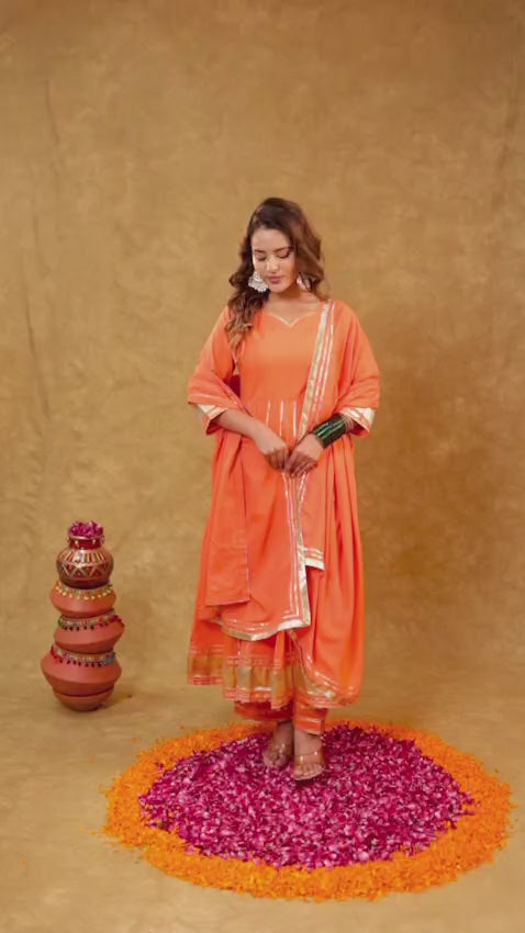 Bold yet elegant, the Kesar Noor Kalidar is all about festive freshness in a warm orange hue. Crafted in soft cotton, this kalidar kurta flows beautifully and features intricate gota laffa work along the sleeves and neckline. Paired with a feather-light mulmul dupatta, it’s a perfect pick for haldi, daytime festivities, or when you want to stand out in subtle tradition.