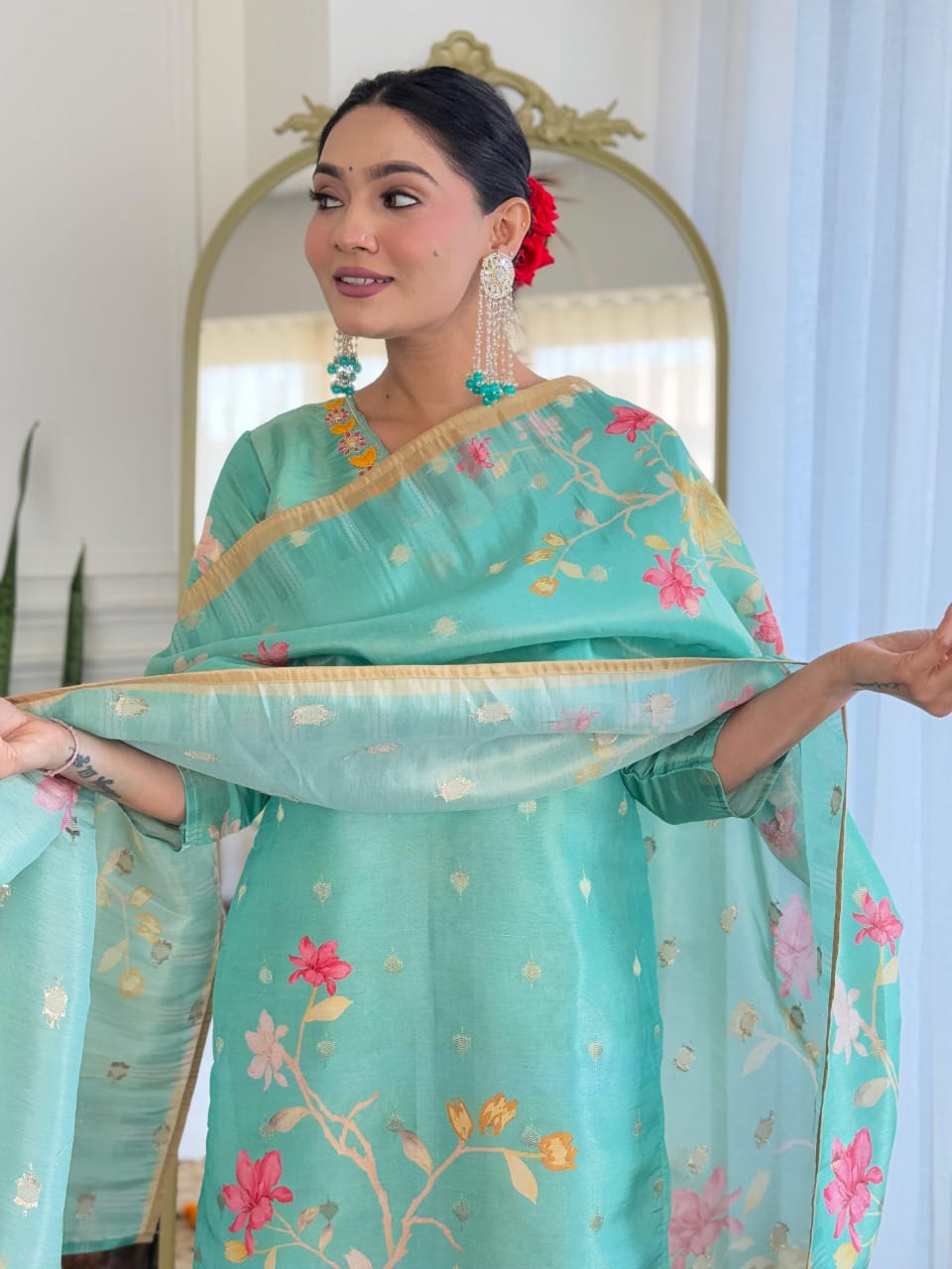 Fabric - Simmer Jacquard work kurti with neck beautiful hand work with simmer jacquard work dupatta and comfy cotton pants