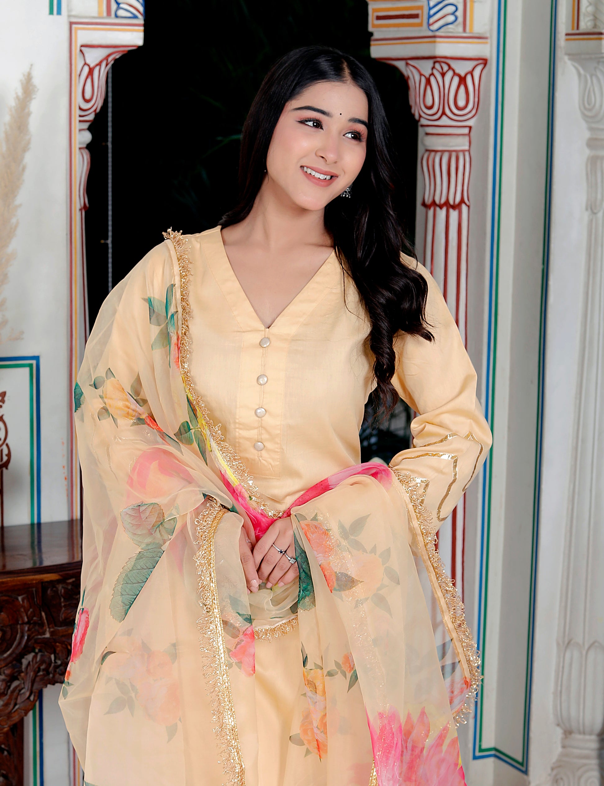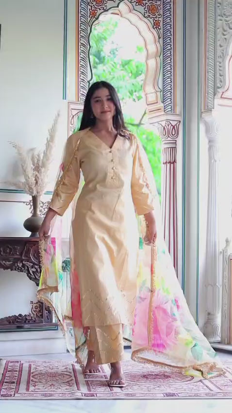 Step into the world of elegance with JAM COTTON KURTA with Printed Organza Dupatta. This 3-piece set is a perfect blend of style and comfort. The YELLOW JAM COTTON features a stunning hot lacework on the tassel, adding a pop of color and charm. Accompanied by a comfortable JAM COTTON pant, the ensemble is completed with a printed organza dupatta, adding a touch of grace. YELLOW JAM COTTON with Printed Organza Dupatta and make a fashion statement at any occasion. KURTA AND PANT WITH BEAUTIFUL GOTTA WORK DETAILING